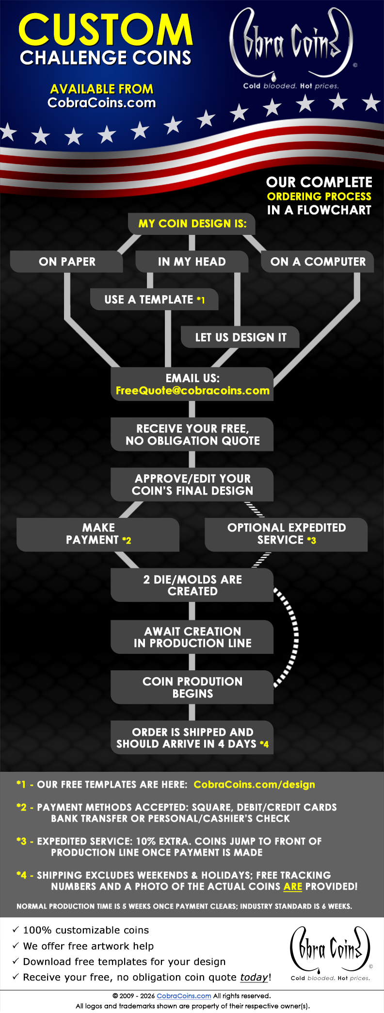 Cobra Coins makes it super easy to purchase custom challenge coins! Our complete ordering process is shown in one simple, easy-to-read infographic: